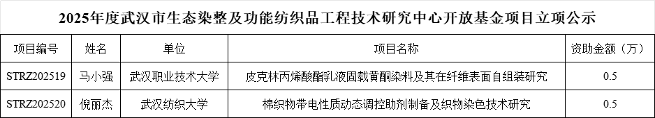 武汉市生态染整及功能纺织品工程技术研究中心2025年度开放基金课题已完成征集和评审工作,经专家评审,重点实验室拟资助项目2项,详见下图。