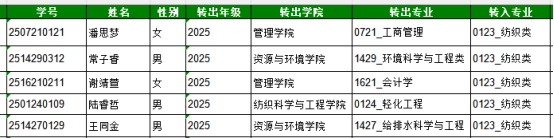根据《武汉纺织大学本科生学籍管理实施细则》,经学生申请、学院资格审查、学院面试评审等环节,现将纺织科学与工程学院2025年2025级学生转专业转入拟定名单公示